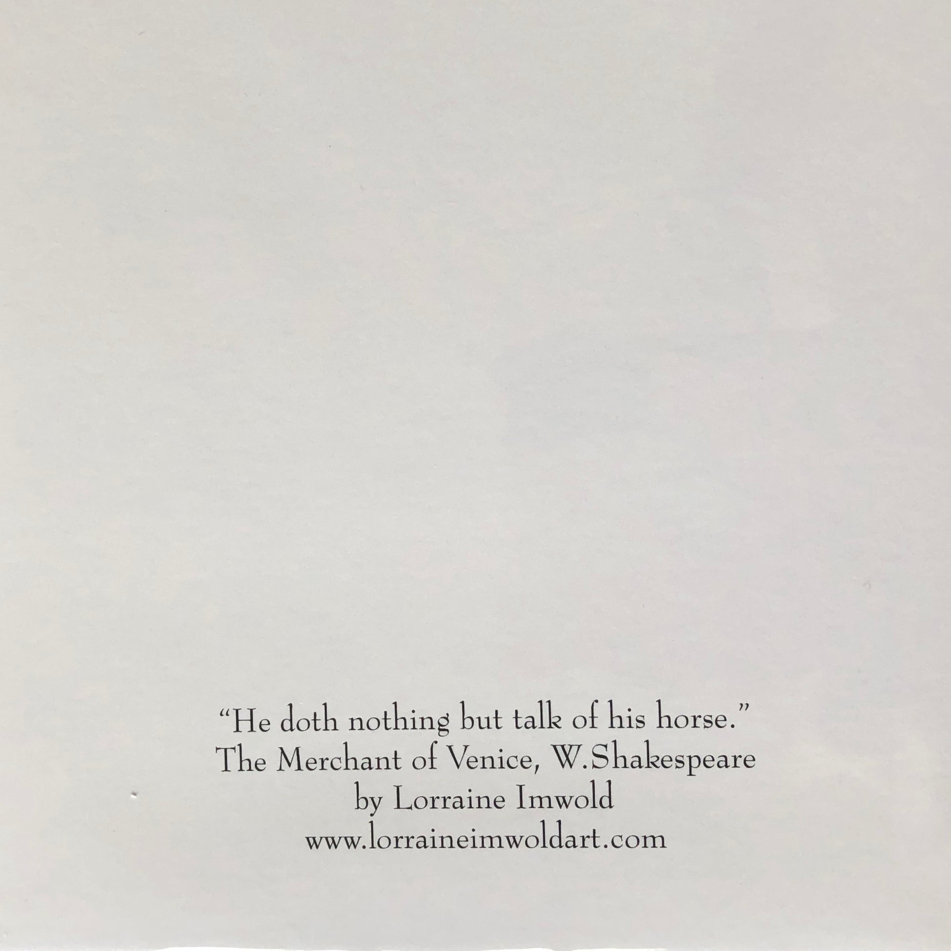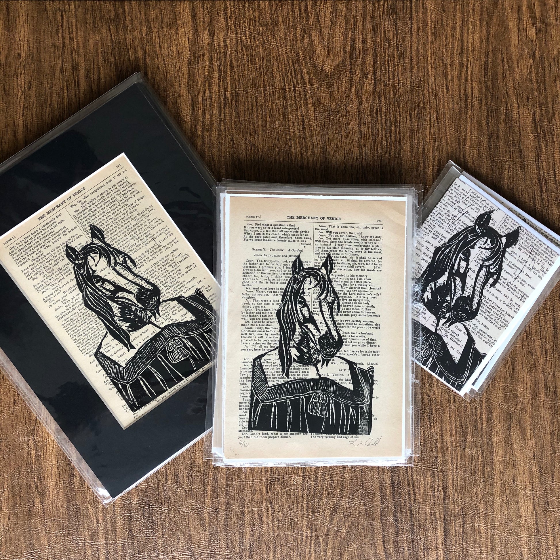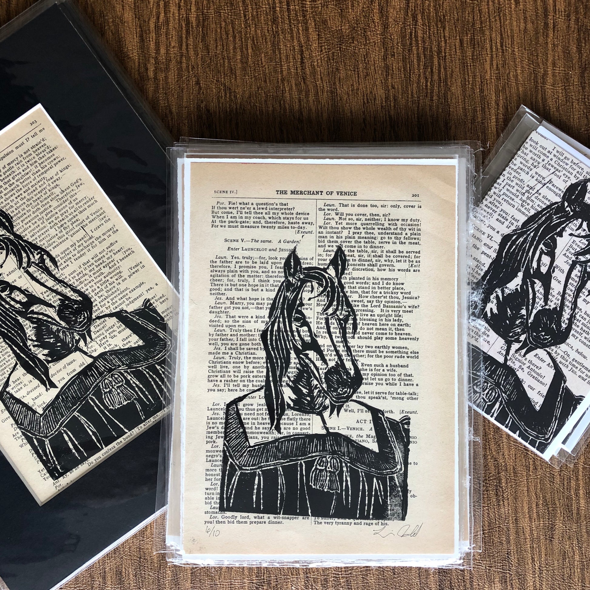 Original hand carved portrait of horse in Shakespearean costume, printed on reclaimed pages from “The Merchant of Venice” script in a complete works.