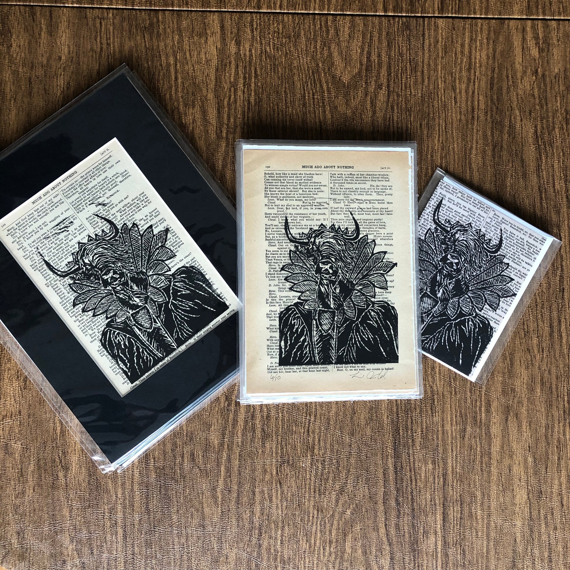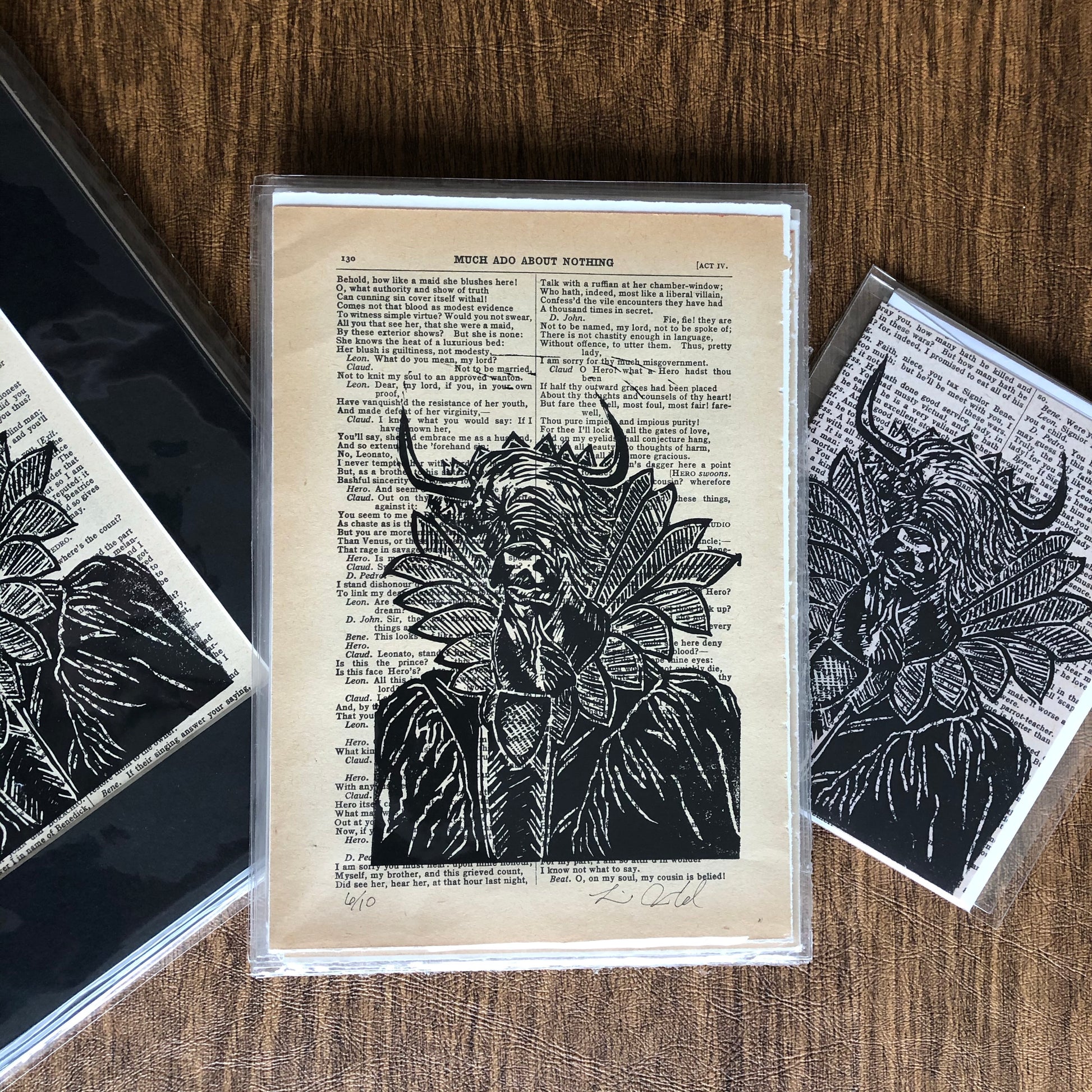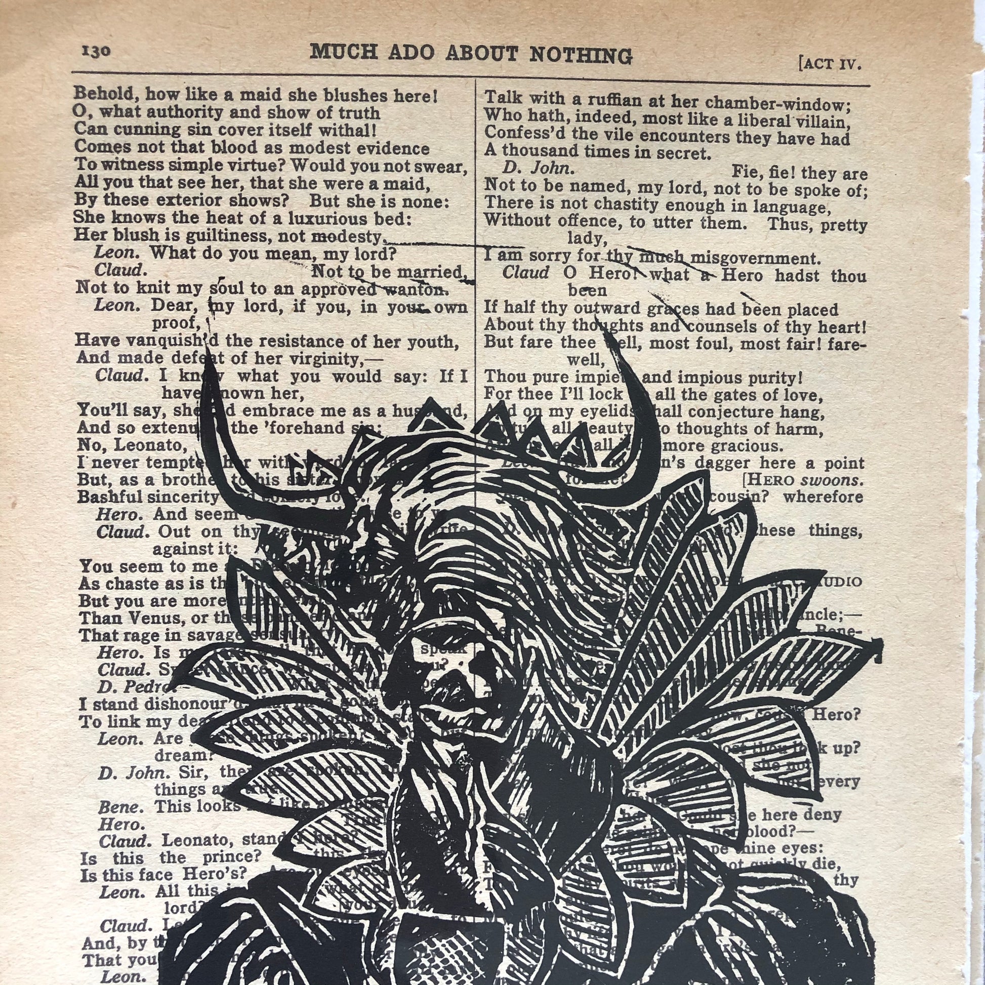 Original hand carved portrait of bull in Shakespearean costume, printed on reclaimed pages from “Much ado about Nothing” script in a complete works.