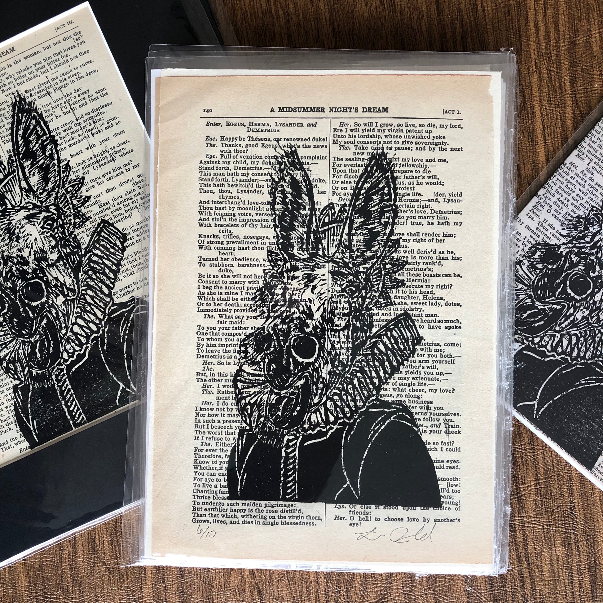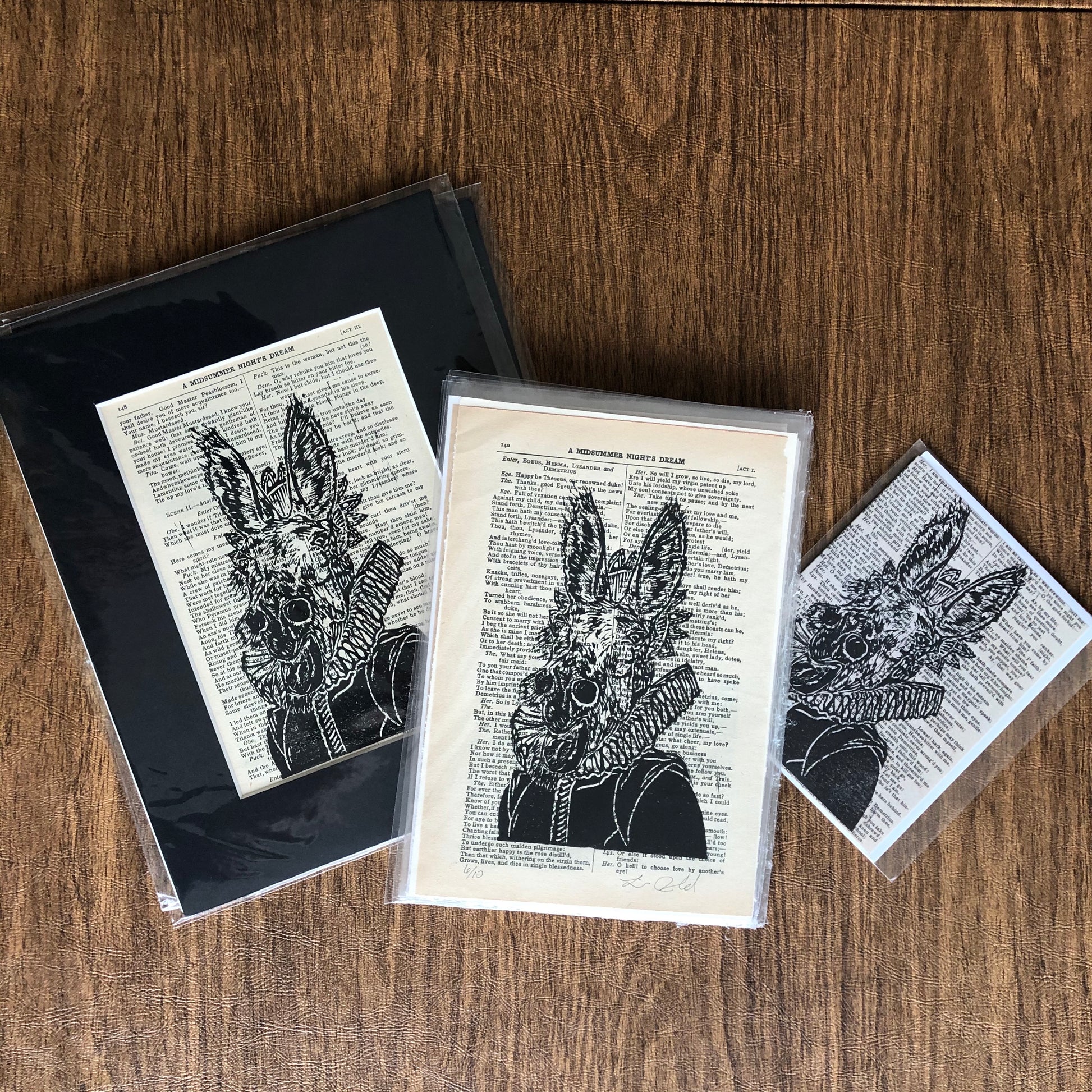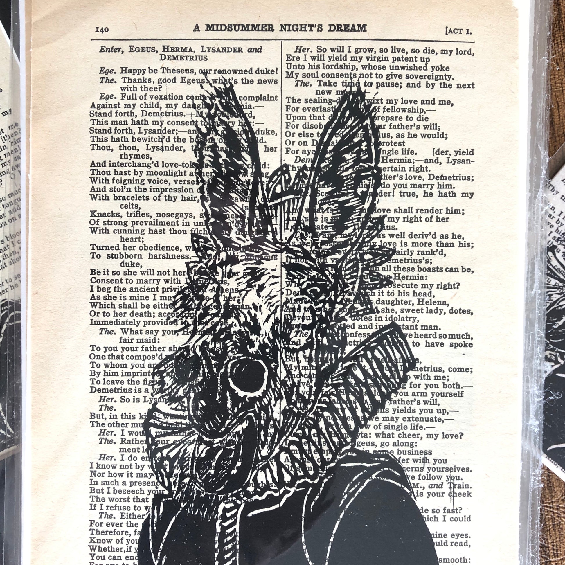 Original hand carved portrait of an Ass in Shakespearean costume, printed on reclaimed pages from “A Midsummer Night’s Dreams” script in a complete works.