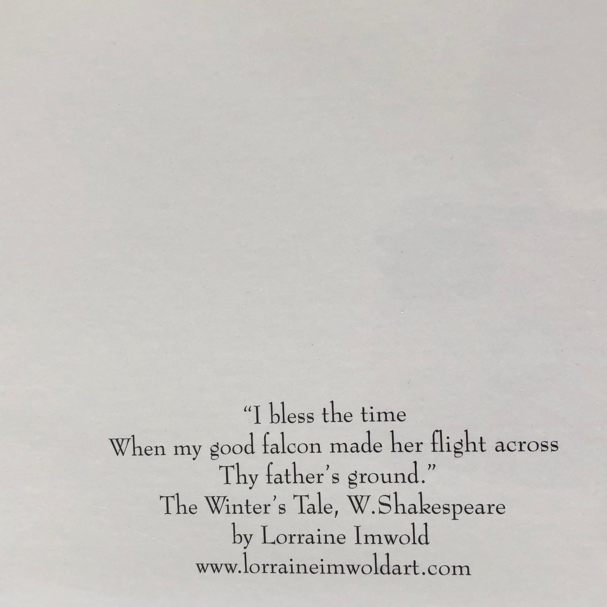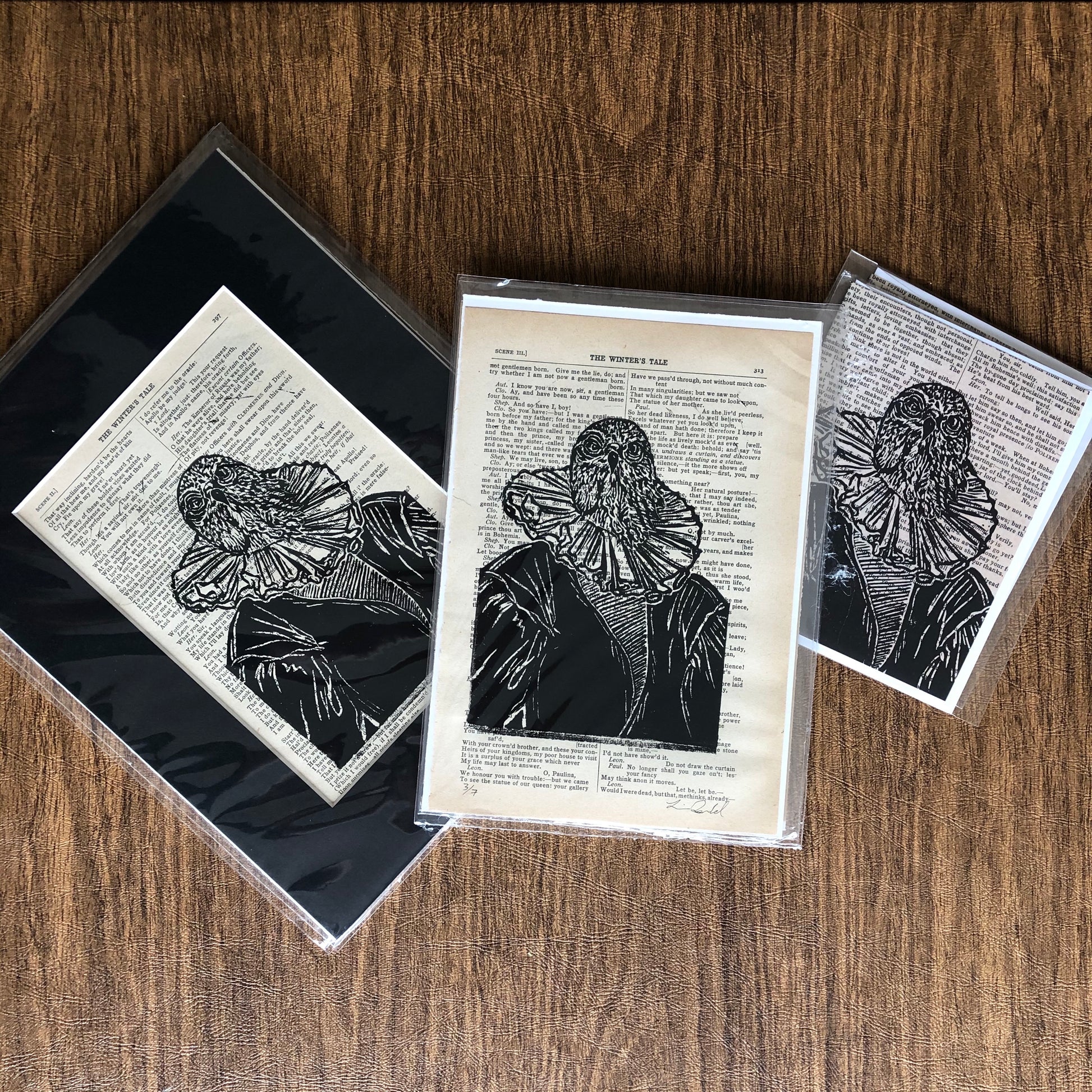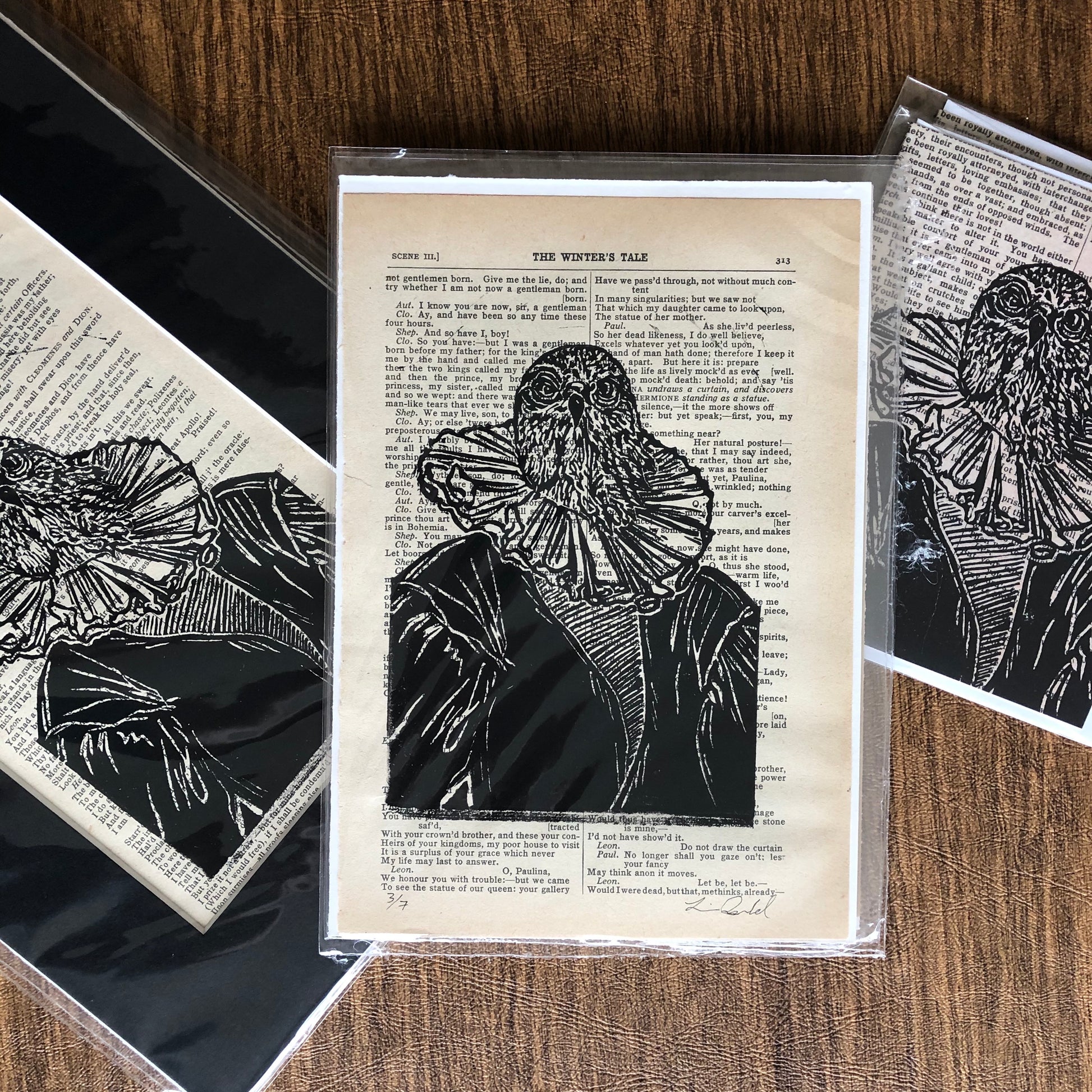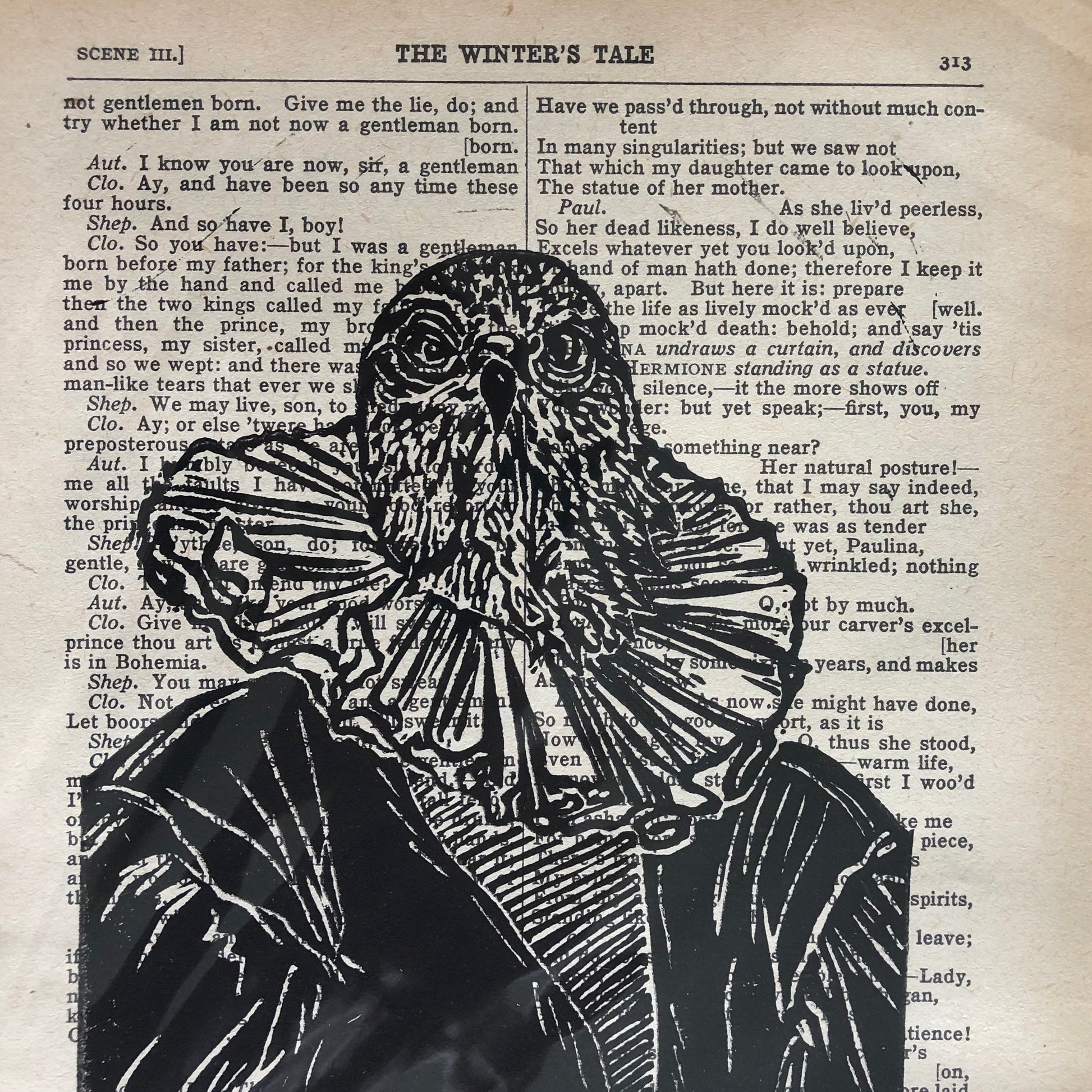 Original hand carved portrait of falcon in Shakespearean costume, printed on reclaimed pages from “The Winter’s Tale” script in a complete works.