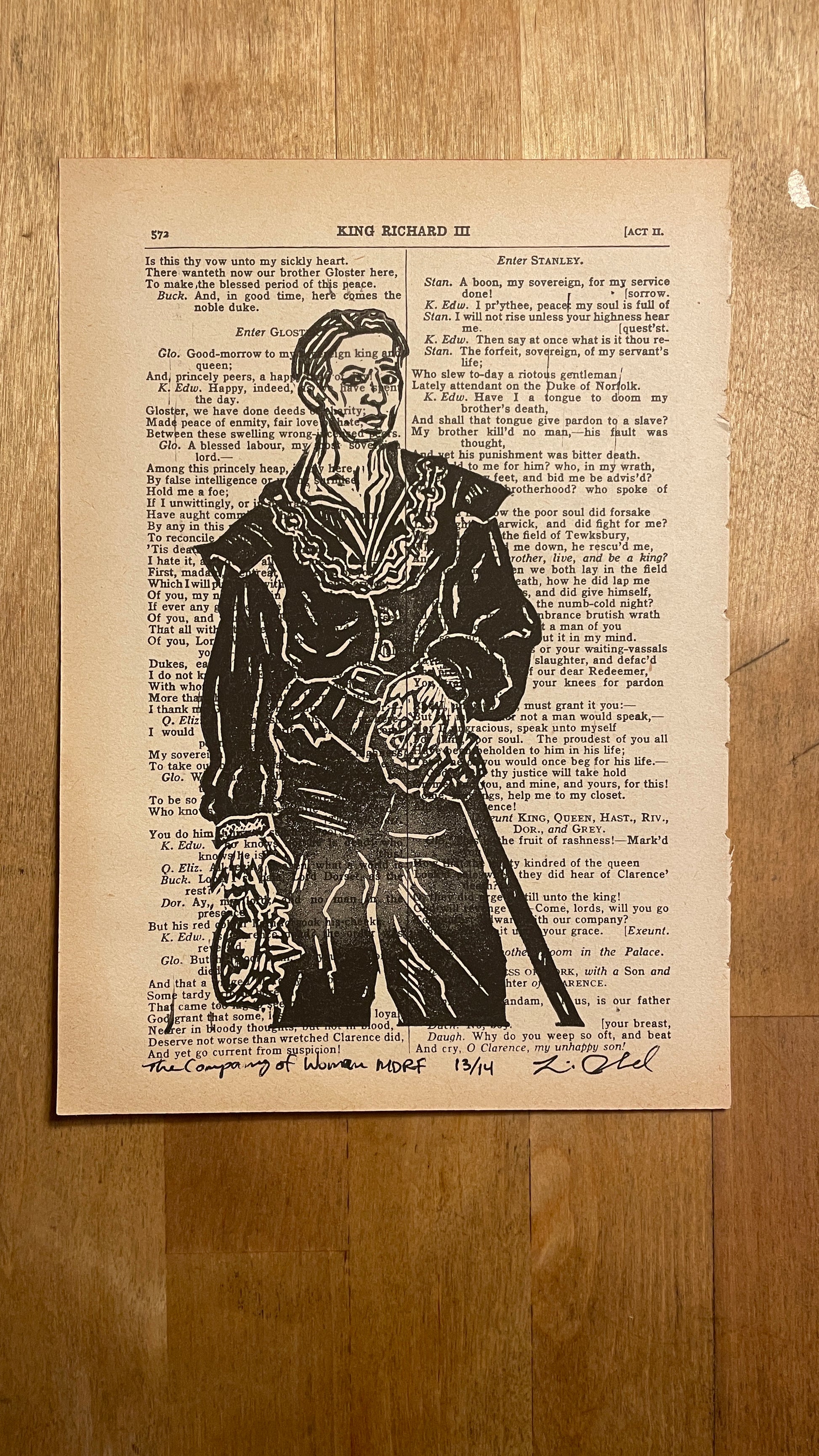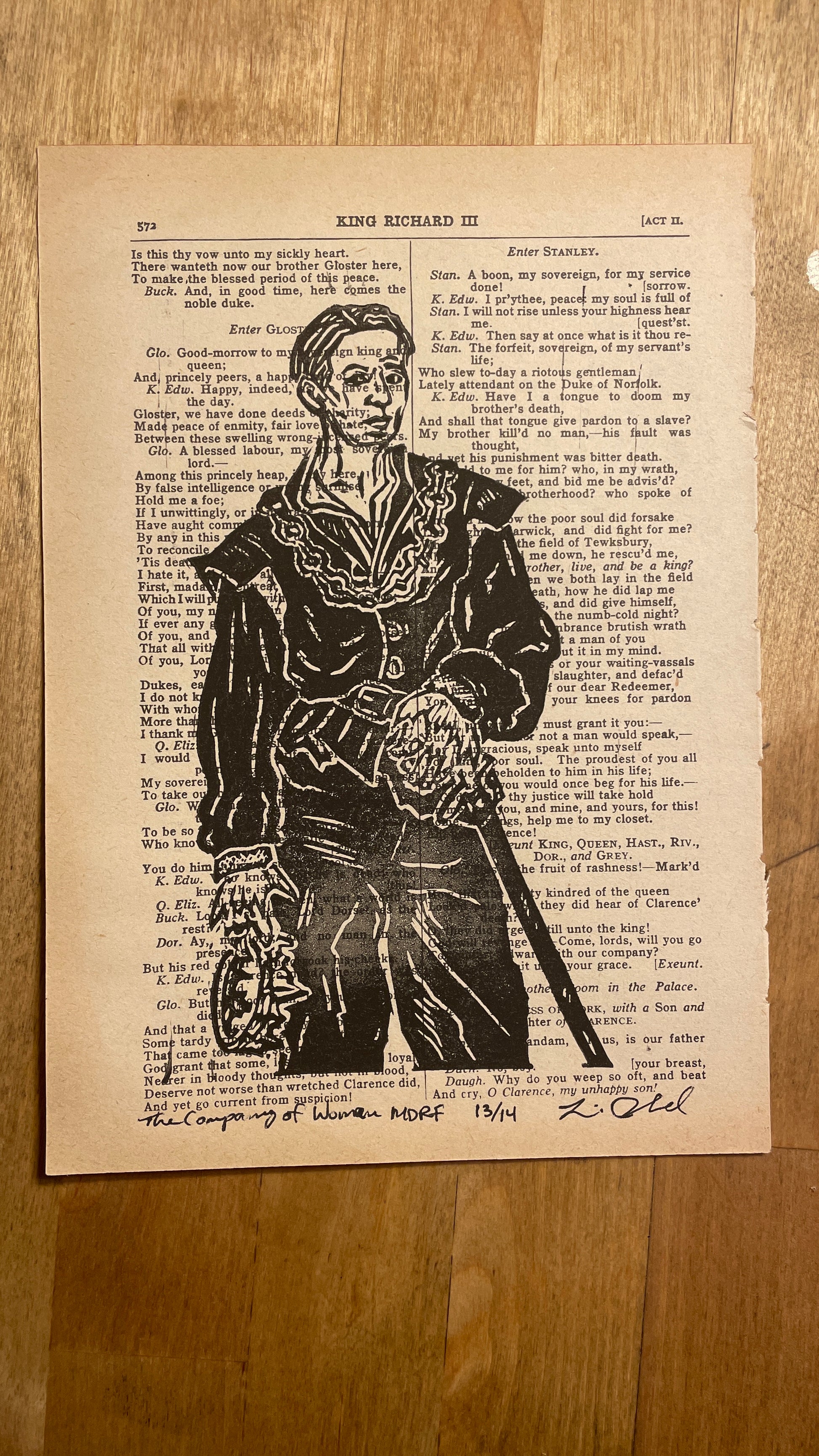 It is printed on a set of script pages from William Shakespeare’s Richard III.