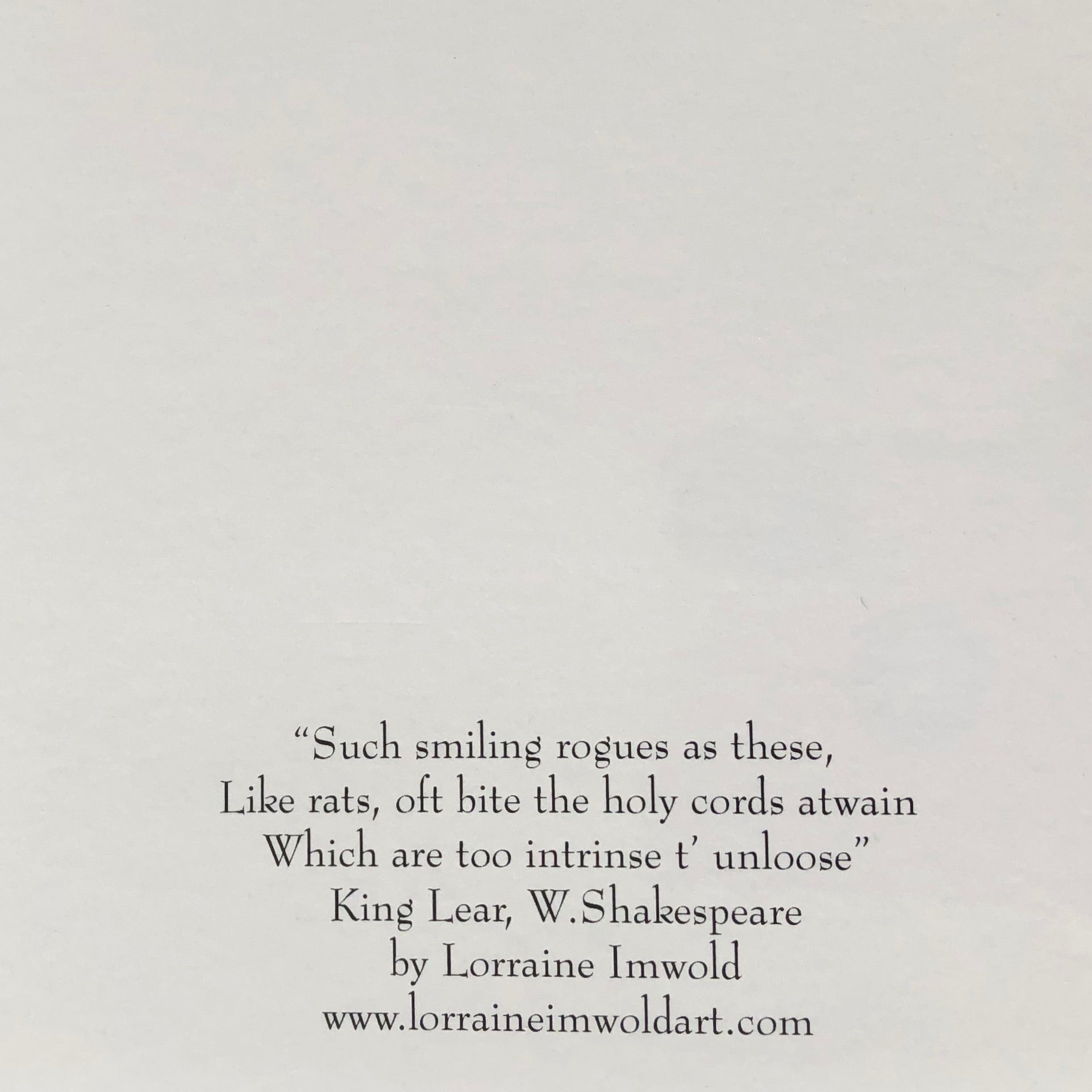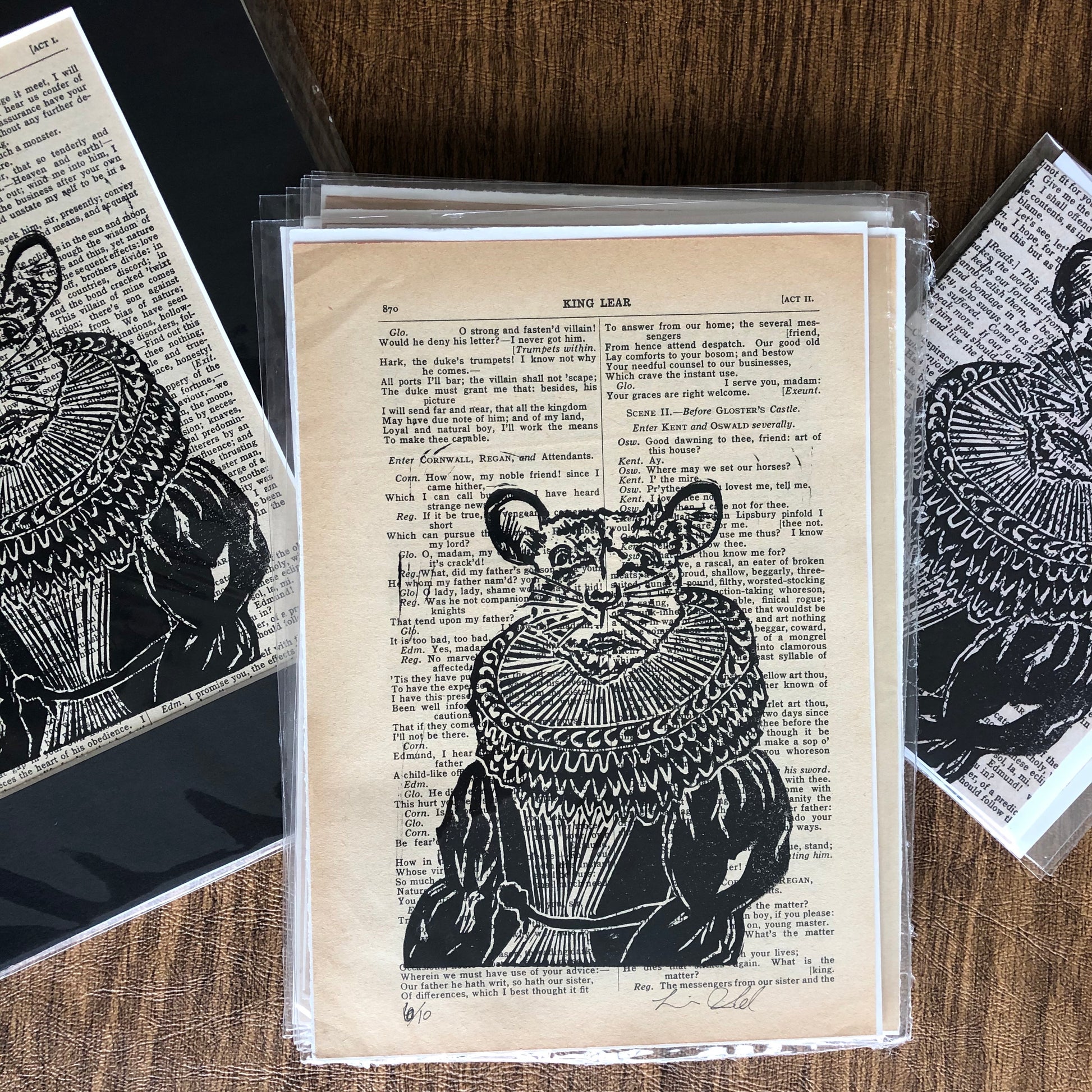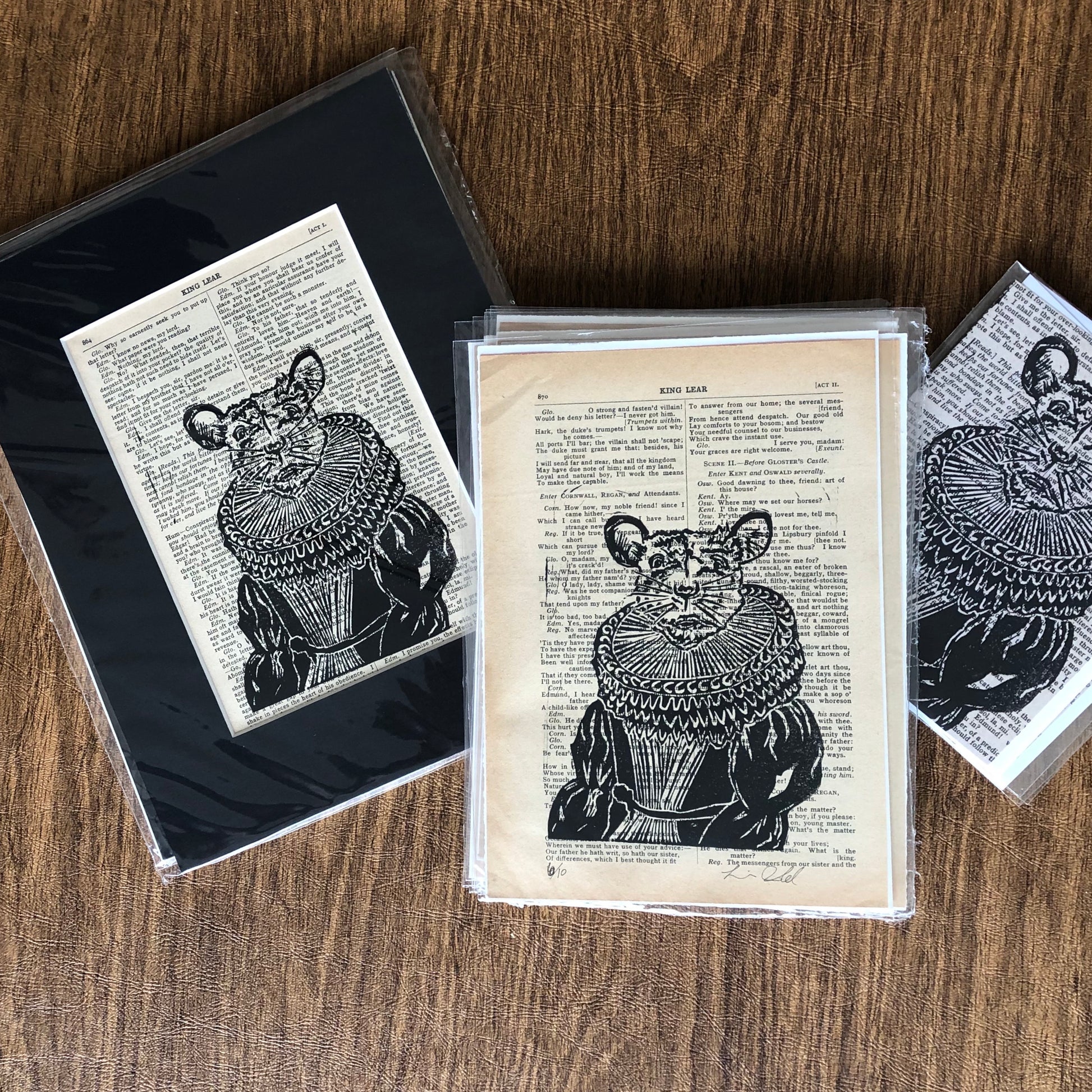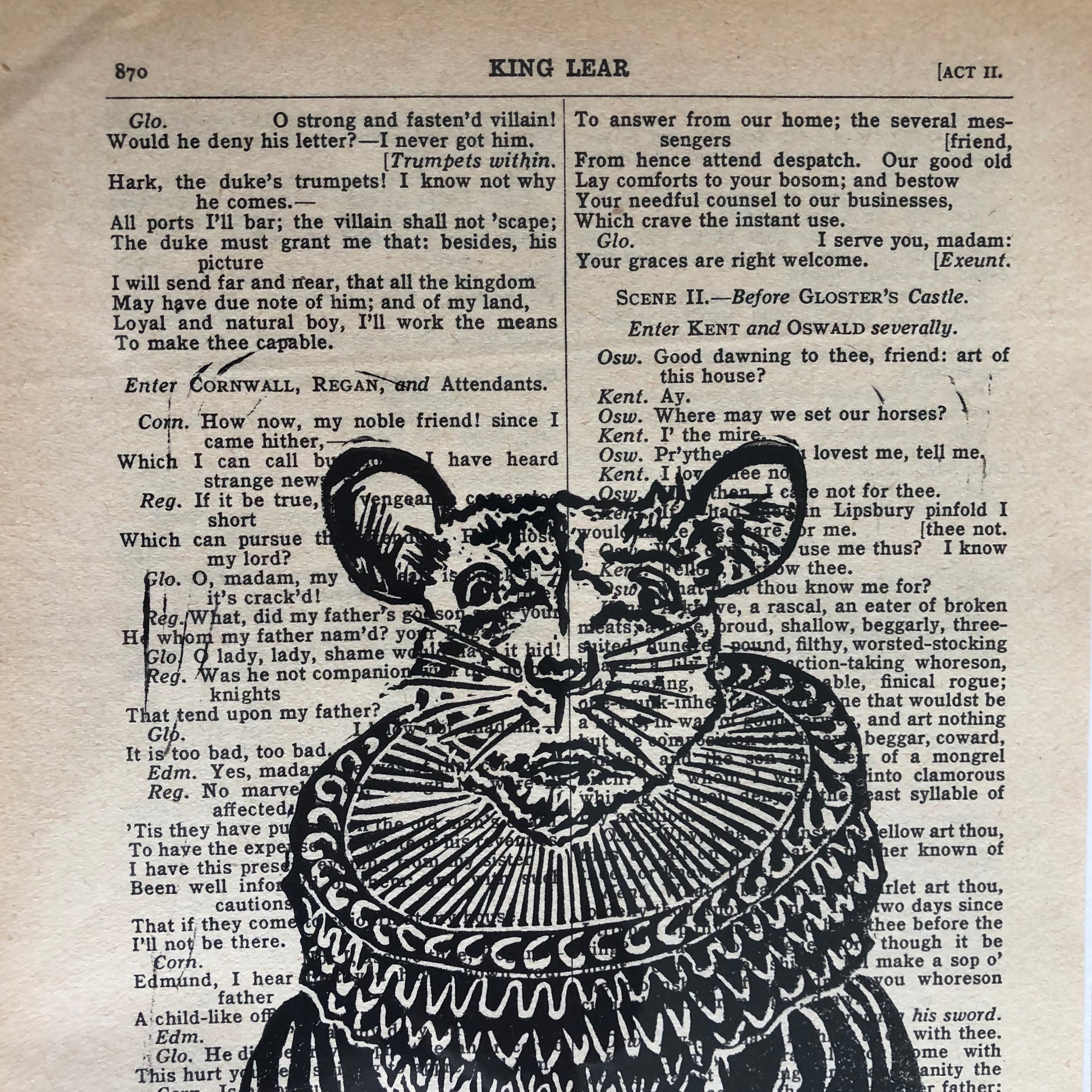Original hand carved portrait of a rat in Shakespearean costume, printed on reclaimed pages from “King Lear” script in a complete works.